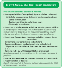 Si envoi papier (portfolio, clef USB), les faire à l’adresse suivante : EMCA, Château de Dampierre